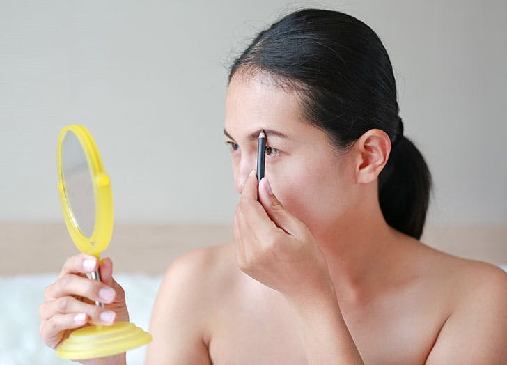 Чтобы не промахнуться и не нарисовать бровь на лбу, посмотрите на себя в зеркало сверху вниз и наморщите лоб, таким образом вы обнаружите начало бровной дуги и сможете прицельнее скорректировать выражение глаз.